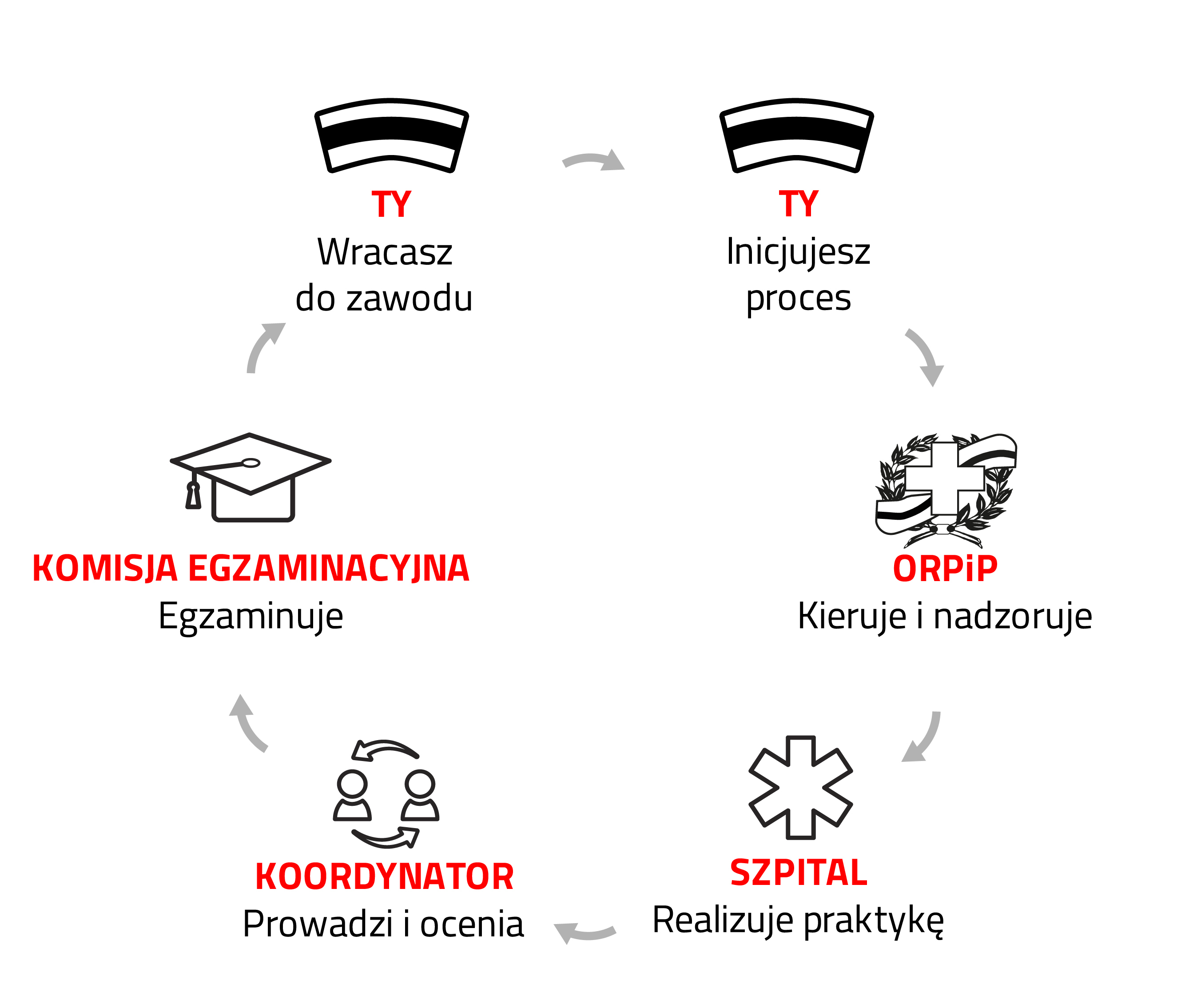 Proces powrotu do zawou angażuje kilka kluczowych osób i instytucji. Poniższy schemat przedstawia ich wzajemne relacje i przepływ odpowiedzialności, od Twojego wniosku po finalne zaświadczenie.